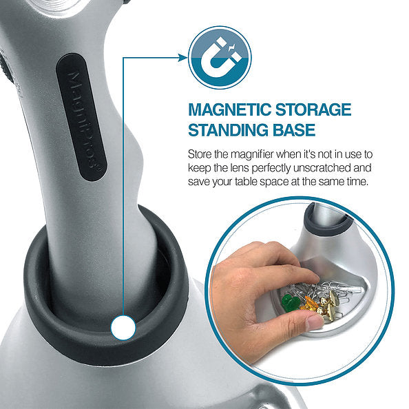 - COMFORT ERGONOMIC HANDLE & MAGNETIC STORAGE BASE: Only weights 7 ounces, and the handle of this LED magnifier is ergonomically designed to grip/hold for most hands, making it ideal for anyone who loves to read for longer period of time. And the standing base is designed to perfectly store your magnifier at ease when not in use without taking up too much of your table space.