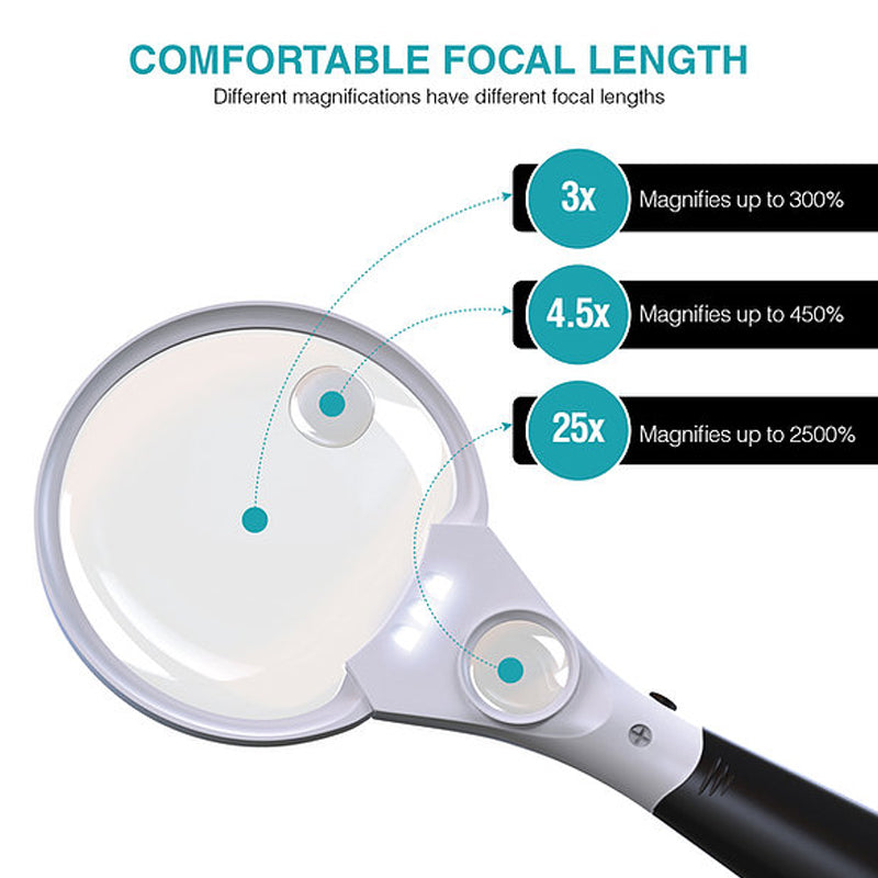 • 3 Ultra Bright LED Lights with 3X 4.5X 25X Power Magnifying Glass with Light