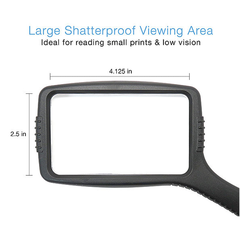 - RECTANGULAR SHAPE & LIGHTWEIGHT DESIGN: The magnifier itself only weight 5 ounces , therefore, it is ideal for longer reading time, it weights only half compare with other reading magnifiers.Rectangular magnifying glasses are superior to round magnifier, it provides the optimal, most natural shape for reading text without having your hands move all the time. The larger field of viewing lets you read a full line from left to right.