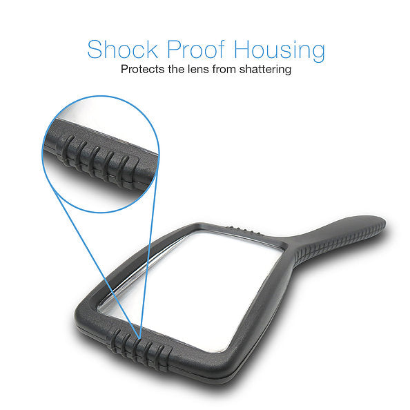 - SHOCKPROOF & SCRATCH RESISTANT DESIGN: There are two shockproof design housing on both sides of magnifying lens to prevent it from shattered and scratch on surface, you can lay magnifier on flat on table and won't even cause a single scratch!