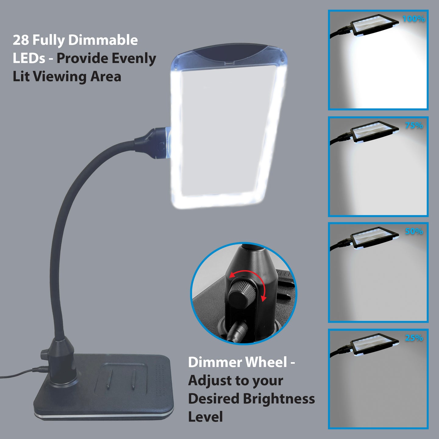 - Anti-Glare & Fully Dimmable LED Lights: Our magnifying lamp is equipped with 28 pcs of bright SMD LEDs, easily turn the dimmer knob right or left to adjust to your desired brightness level with seamless dimming.