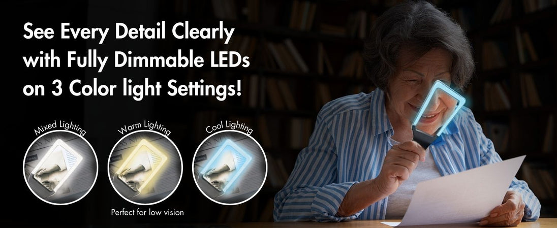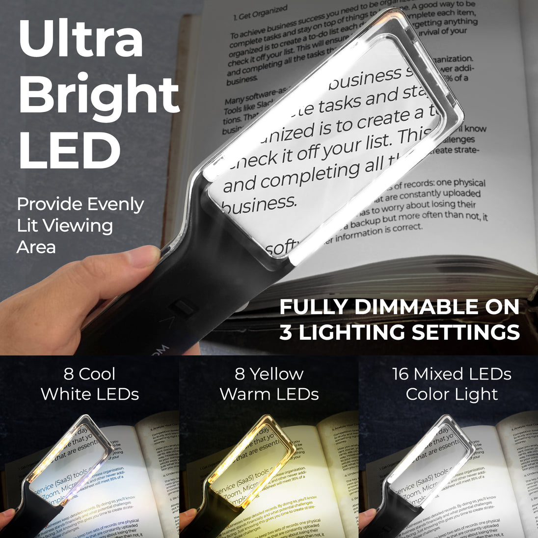 ★ Revolutionary 3-Color LED Lighting for Optimal Clarity: Experience the latest in lighting technology with our advanced ONE-button design, making it effortless to toggle between cool, white, and combo lighting modes. Tailor your reading experience to any condition with ease. Perfect for low vision individuals, this magnifying glass illuminates small print for crystal-clear visibility.