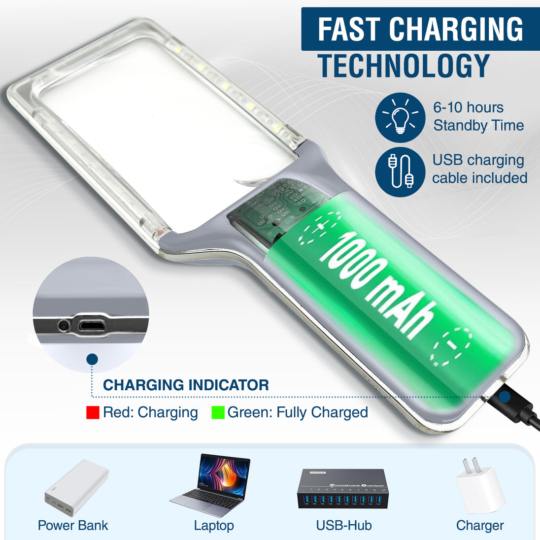 ★ RECTANGULAR SHAPES THE WAY YOU NATURALLY READ: The rectangular lens is especially design to simulate the way we naturally view things from left to right, the magnifying lens covers large viewing area without having your hands move all the time, lens is measured 4.35"x 2.7" and magnifies up to 600%.